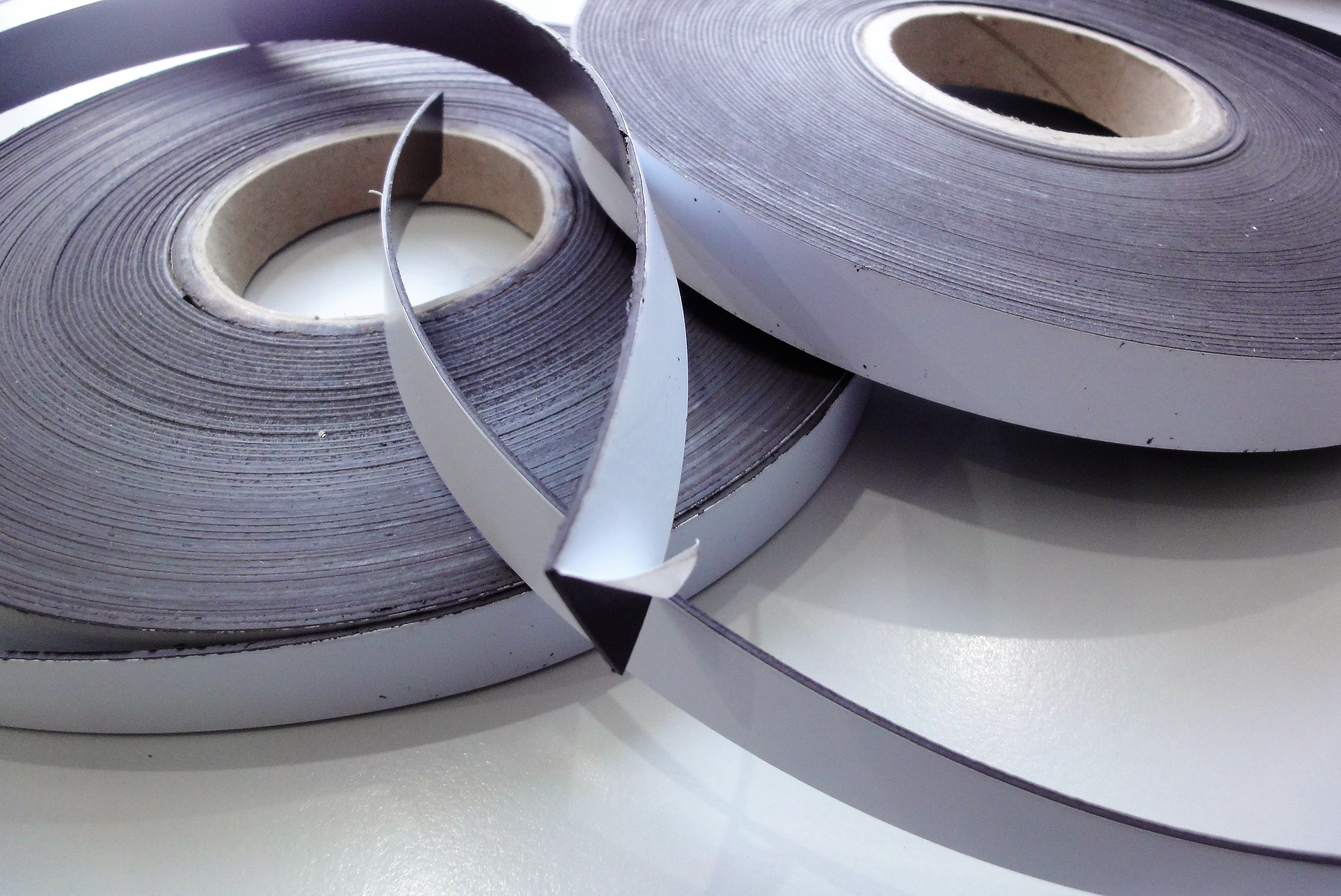 A fita magnética adere com facilidade a qualquer superfície metálica, é muto flexível e mantém-se magnetizada de forma permanente. Podemos fornecer este material com diferentes acabamentos: natural, com adesivo, em rolos ou lâminas com diferentes espessuras, comprimentos e larguras e com revestimento de vinil branco resistente à água, ao álcool, carbonato de sódio e outros agentes.